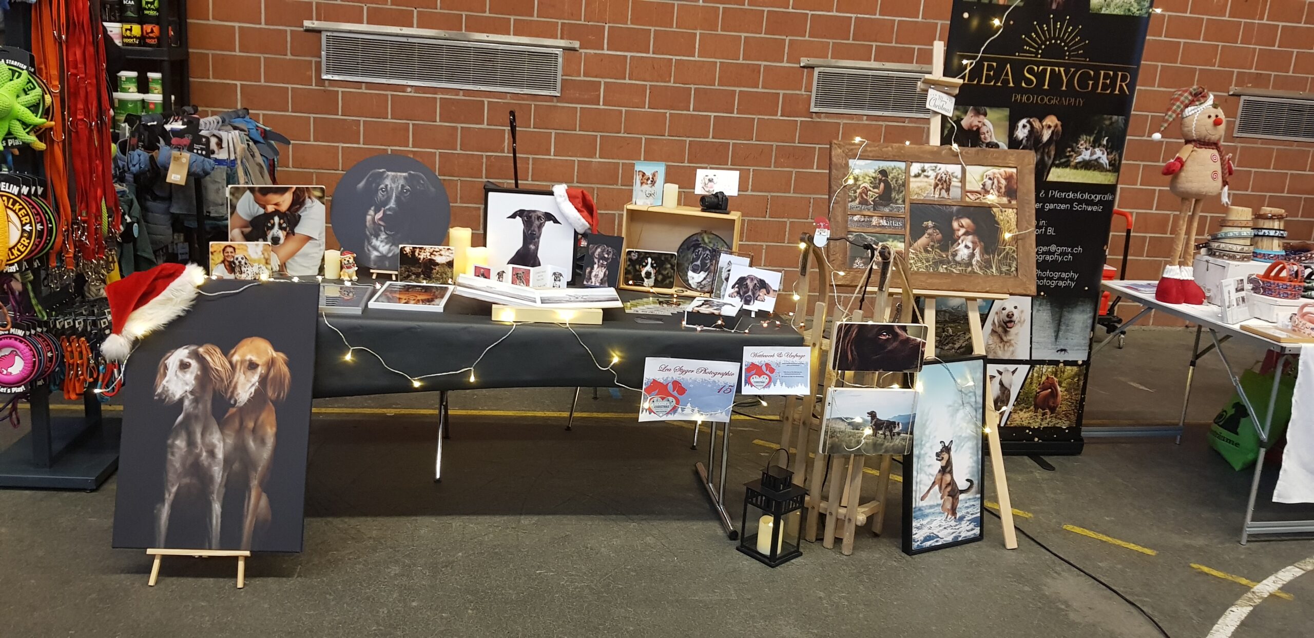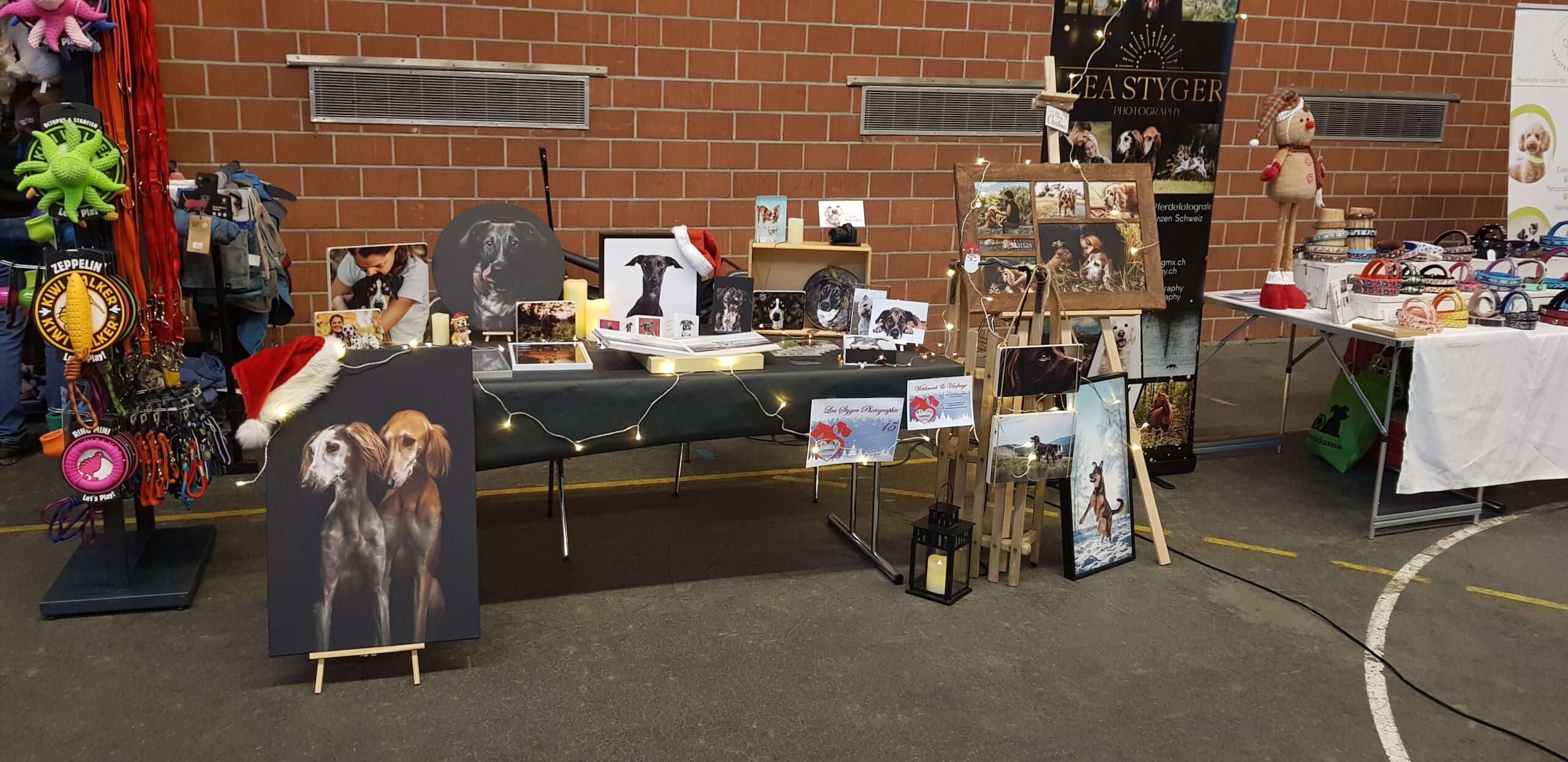Früh morgens ging es für mich wieder von Bubendorf nach Lenzburg. Dieses Jahr bekam ich einen tollen Stand in der grossen Halle, was mich sehr freute. Ich fühlte mich sofort wohl dort und begann, meinen Stand aufzustellen. Beim Doggy Christmas habe ich nicht ganz so viele Produkte dabei wie an der Hundemesse in Winterthur und das Aufhängen an den Wänden fällt weg. So habe ich gemütlich meine Produkte auf dem Tisch, auf meiner Staffelei und auf meinem Schlitten drapiert. Und wieder hatte ich auch ein paar Lichterketten und andere Weihnachtliche Deko dabei. In diesem Jahr gab es keinen Kalender von mir, deswegen habe ich der Tombola einen Wertgutschein für ein Fotoshooting bei mir gesponsert. Darüber hat sich jemand sehr gefreut und auch gleich bei mir am Stand bedankt.